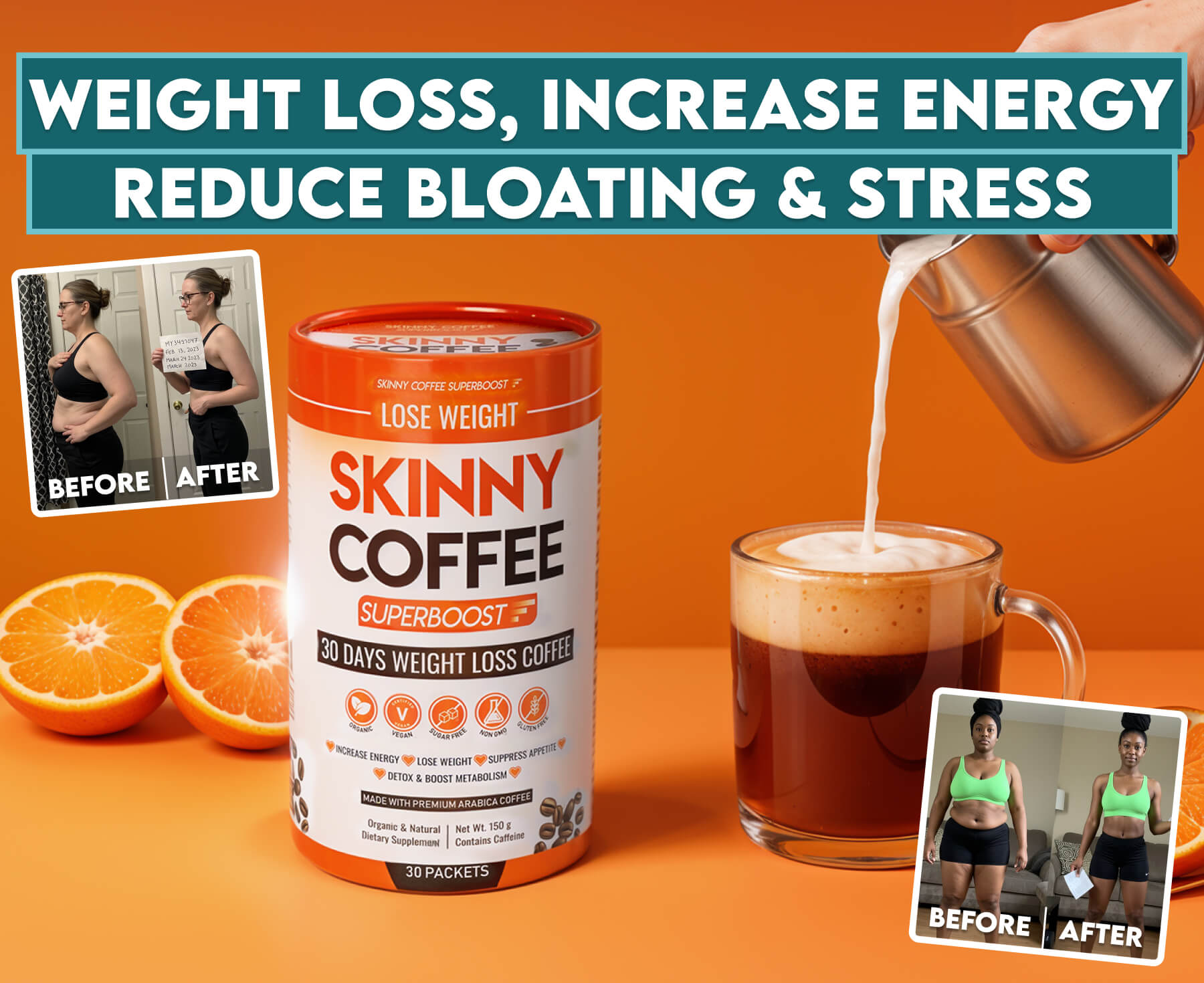 Skinny Coffee is formulated with 15 superfoods designed to energize the body, boost metabolism, suppress appetite, and help you to lose weight. Our all-natural, vegan & organic coffee promotes healthy digestion and relieves uncomfortable bloating in your belly. Skinny Coffee contains powerful ingredients that help to enhance your immune system and fight damage to your cells.